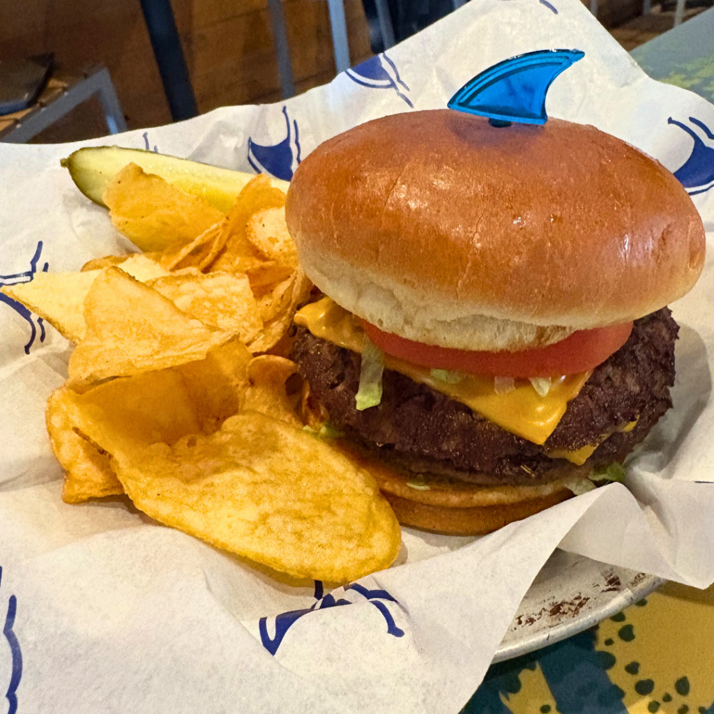 ✓ 1 LandShark Burger with Chips: Landshark burger with a side of crispy chips.