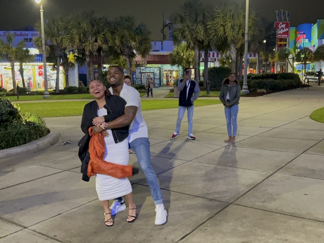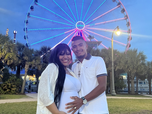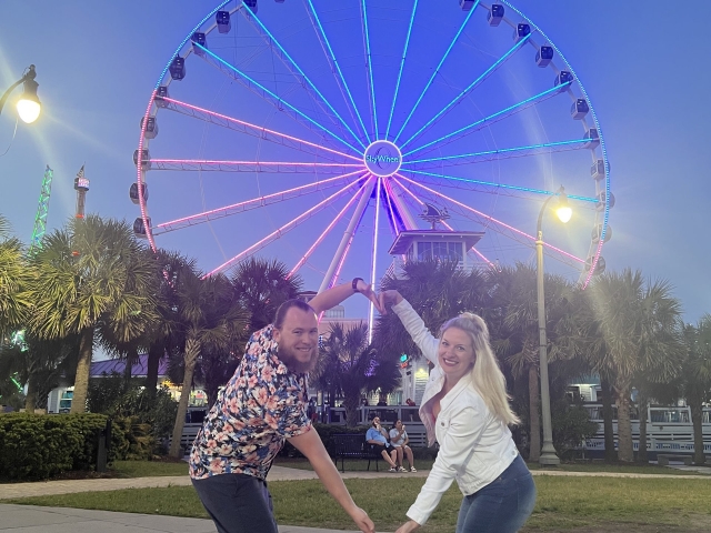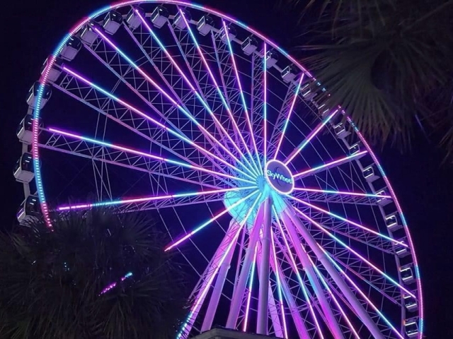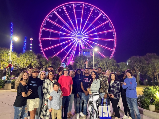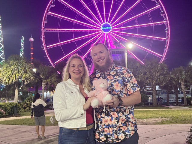 We’ll start by walking with you to Plyler Park next door, where the parents-to-be and loved ones will await the light show reveal at sunset. The light show will flash blue and pink before turning off completely for the reveal. After a moment of suspense, the SkyWheel will shine all pink or all blue in honor of your new baby and the gender color will be on display for the remainder of the hour.